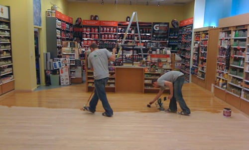 Rhodes Hardwoodʼs maintenance procedure for sports floors and other commercial floors is odorless, dustless, fast drying and very durable. Best of all, most jobs can be done in 1 day or less.